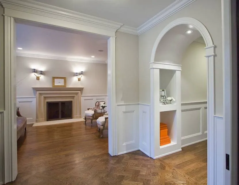 Открытый дверной проем арочного типа с деревянной отделкой и мини-перегородкой с полочками