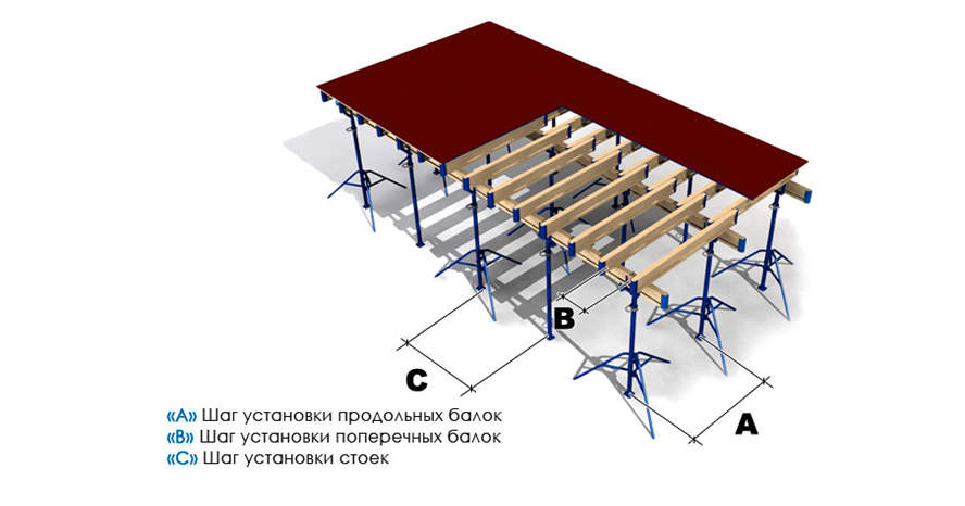Одна универсальная стойка выдерживает нагрузку в 2-3 тонны. Такая опалубка применяется при высоте перекрытия до 4,6 м и толщиной перекрытия до 300 мм. Что вполне подходит для домашнего использования.