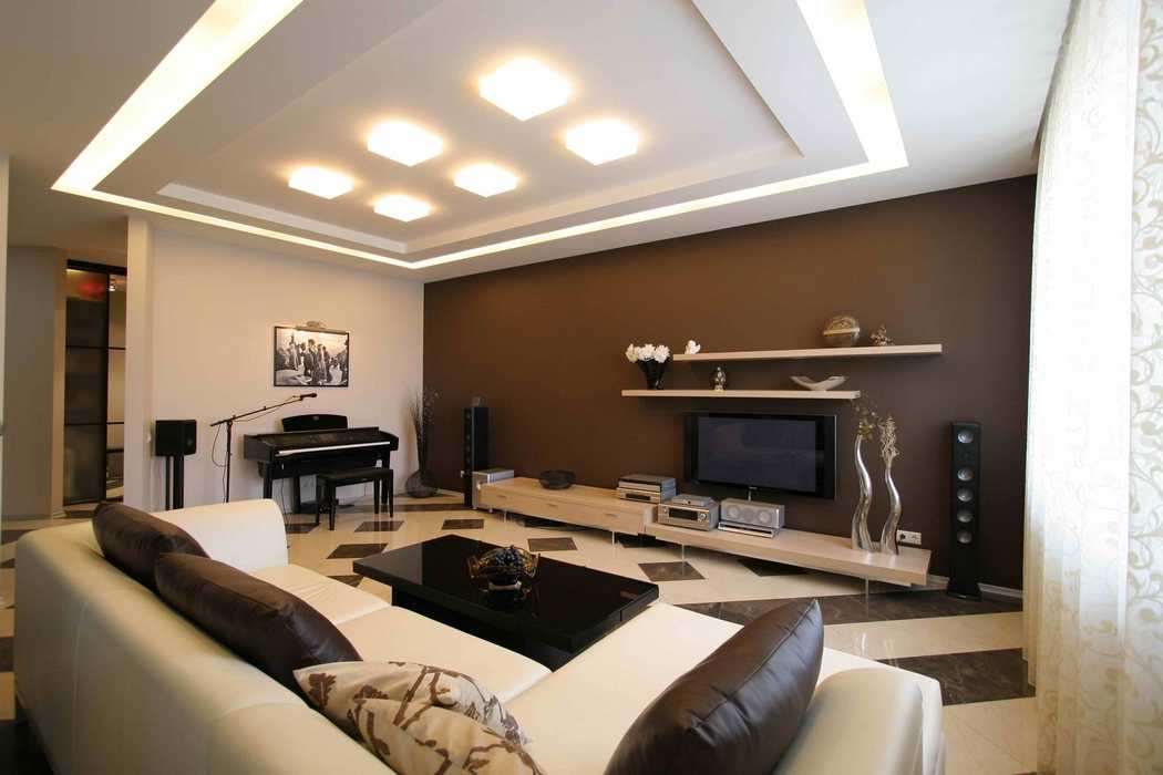 - Круглая. Лаконичные плавные линии смягчают интерьер. Если вы не хотите утяжелять пространство гостиной большой люстрой, то круглая световая панель по центру станет и отличным источником света, и украшением. Такая форма придется по вкусу и любителям футуристического стиля.