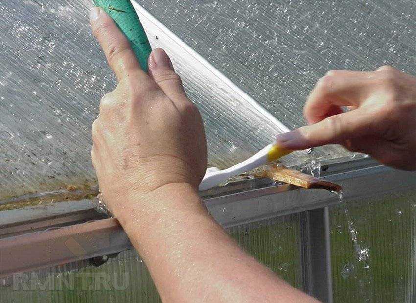 К осени на стенах парника скапливаются остатки травы и листьев, которые из-за влажной среды начинают разлагаться и являются хорошим местом для развития бактерий и плесени. Поэтому чистим поверхности от травы и прочих остатков культур, после чего растворяем в емкости с водой антибактериальное средство, например, горчичный порошок, мыльный раствор или соду. Тщательно промываем стены и даем им просохнуть.